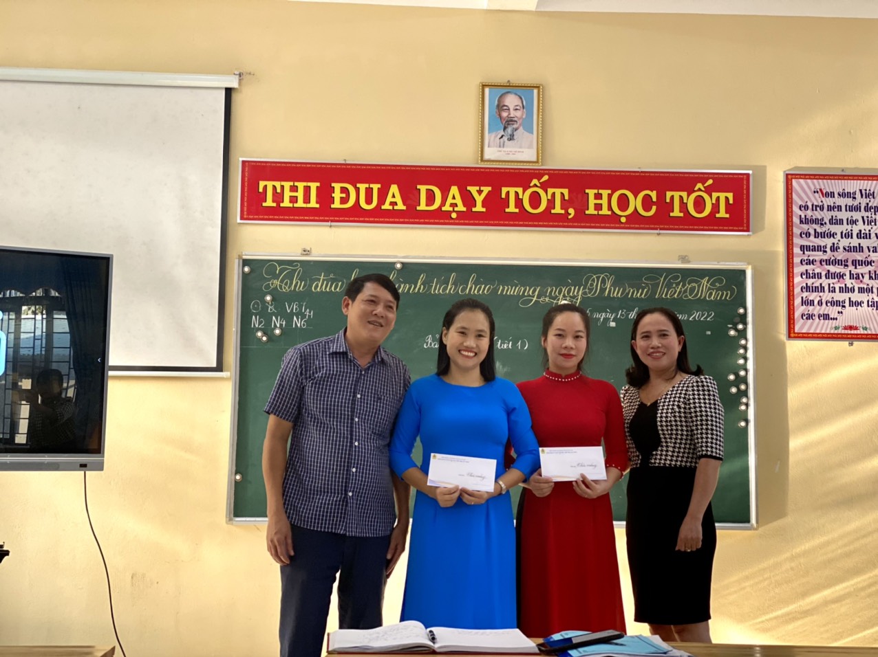BGH nhà trường trao phần thưởng cho hai cô giáo tham gia các tiết hội giảng chào mừng.