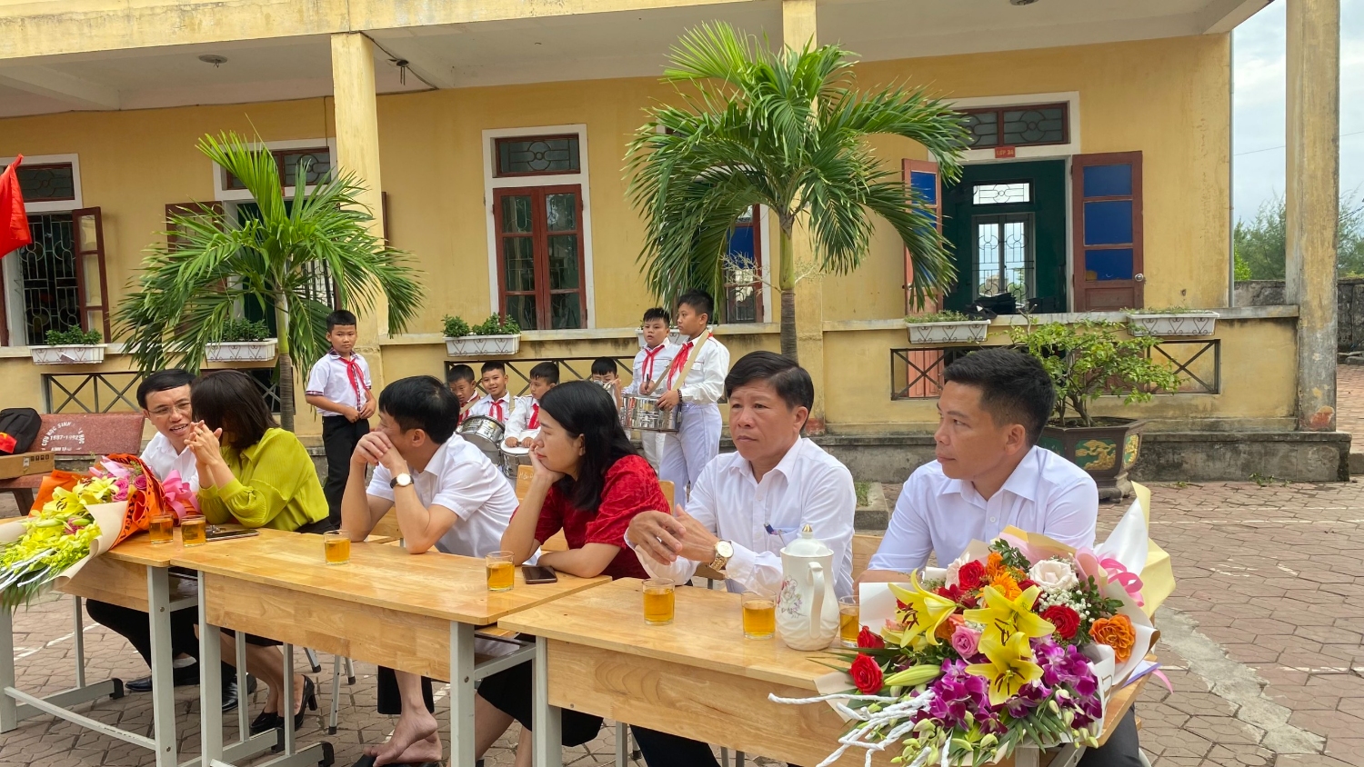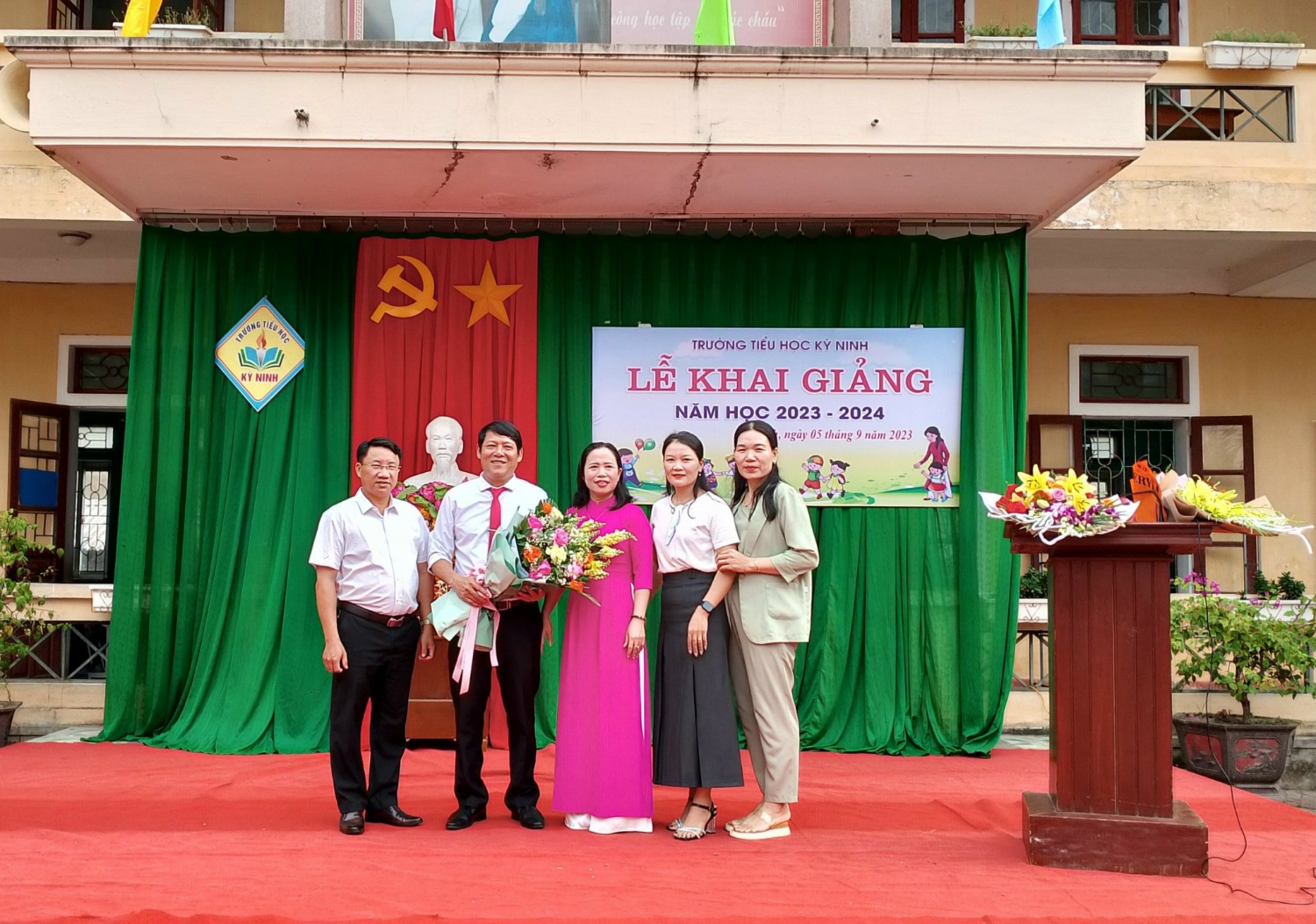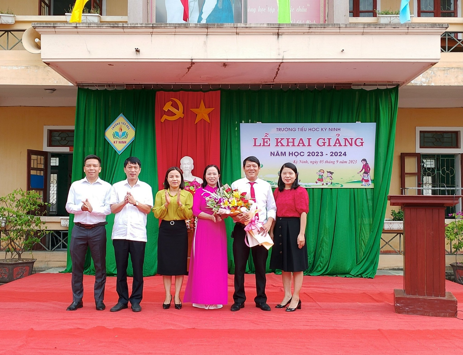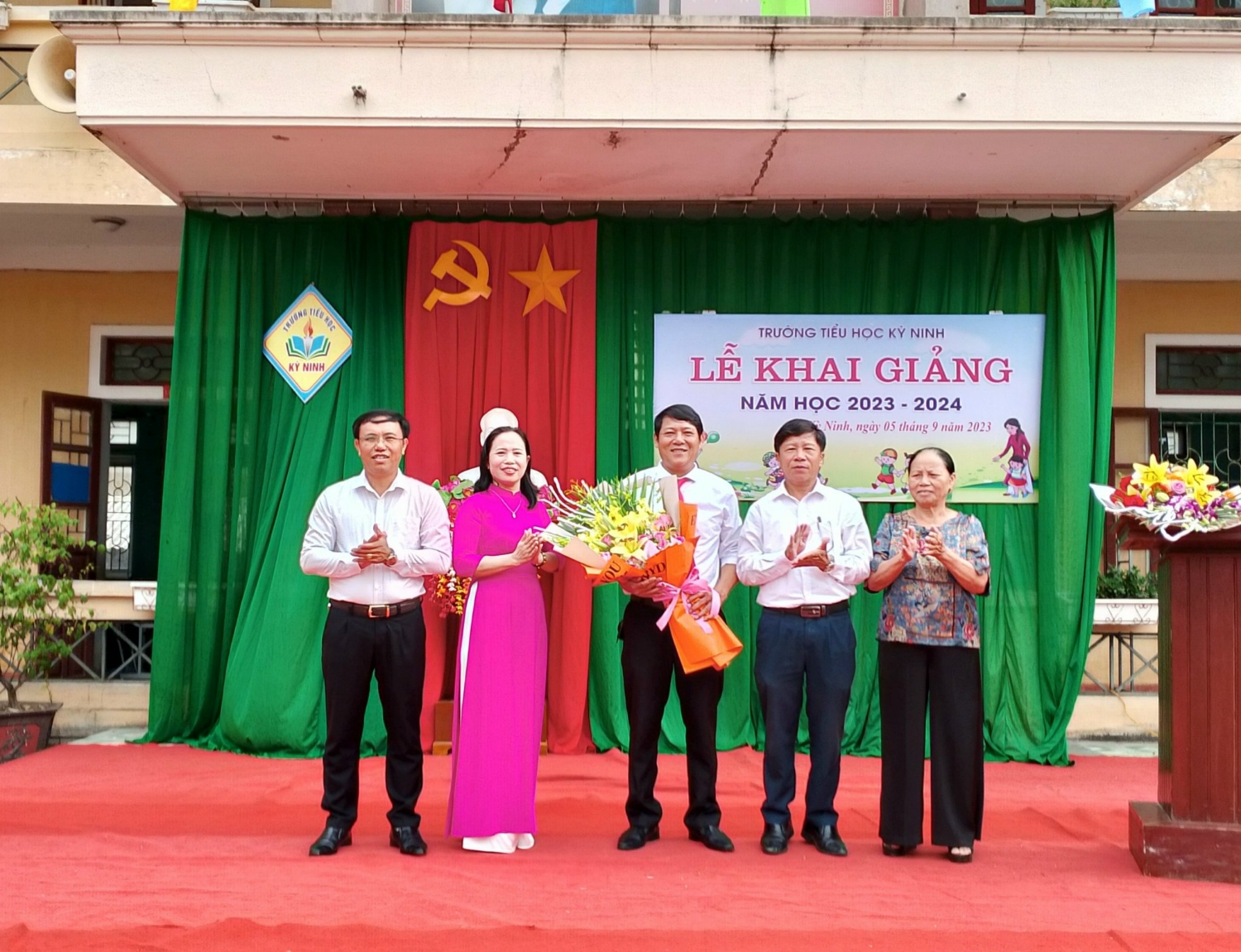 Cũng trong buổi lễ khai giảng, các đc đại diện UBND xã, hội cha mẹ học sinh, các cơ quan đoàn thể trên địa bàn thị xã Kỳ Anh cũng đã tặng hoa chúc mừng tập thể nhà trường bước vao năm học mới, năm học 2023 - 2024.